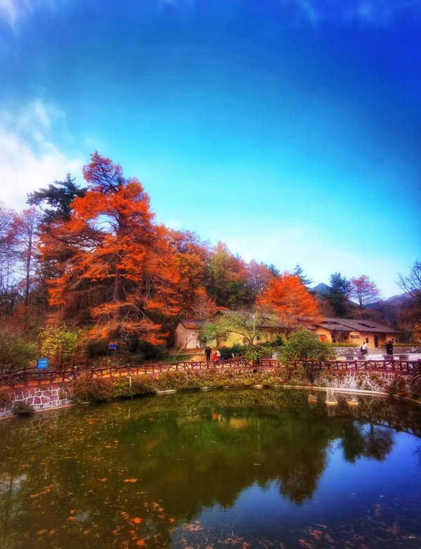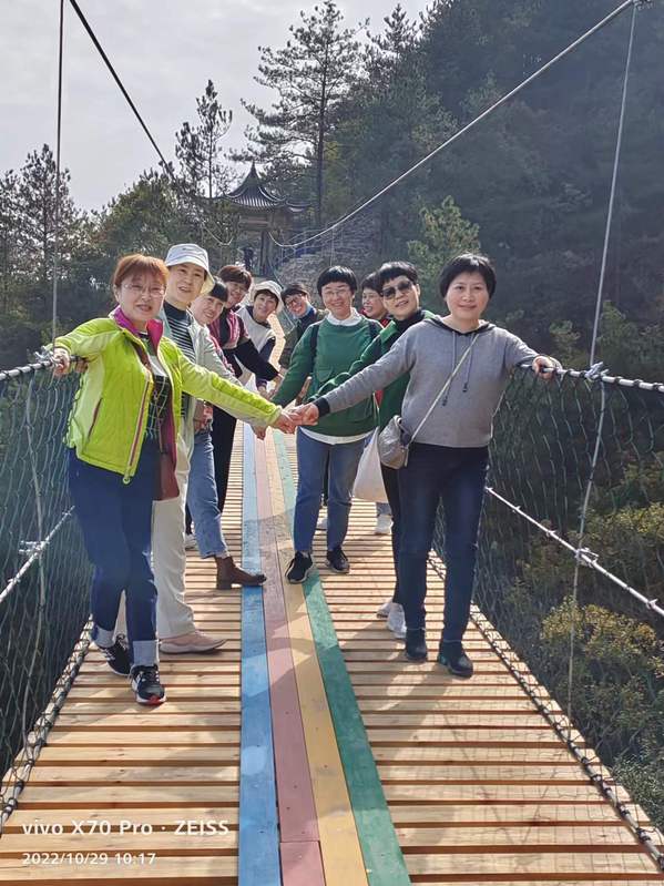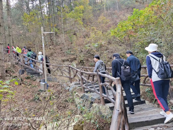 秋高气爽,艳阳高照,大家兴致勃勃地开展了“亲近美丽自然”——飞旗寨登山拓展活动。飞旗峰雄奇壮观,凤凰岭险峻秀美,鸟鸣涧柔情惬意,村寨寺庙古朴自然。身临其境,举目四望,近、远处的群山异峰以及田园村庄尽收眼底,蔚蓝天空、雨后天晴的阳光与山间红色枫叶、黄色银杏、绿色松柏交相辉映,真是风景如画,美不胜收,令人流连忘返。(图、文:章杰义 审稿:彭金德)