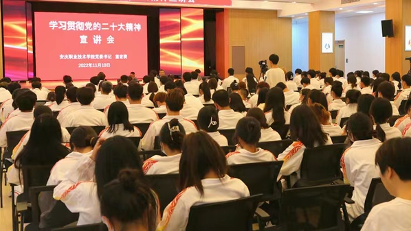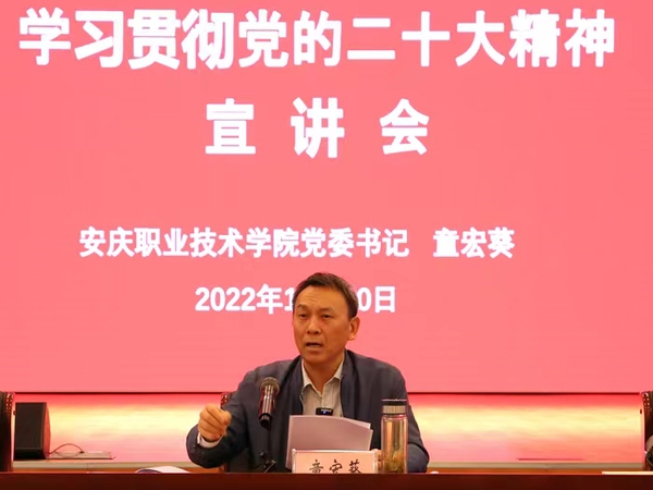 11月10日晚,装饰一新的学校实训楼报告厅座无虚席,洋溢着浓郁的学习氛围和热烈的青春气息。校党委书记童宏葵为师生宣讲党的二十大精神。他强调,要深入学习宣传贯彻党的二十大精神,坚持用新时代党的创新理论武装师生、用社会主义核心价值观塑造师生、用党和国家的辉煌成就激励师生,为全面建设社会主义现代化国家贡献聪明才智。党委委员、宣传部长吴何珍主持。党委委员、统战部部长李五一以及学生处、团委主要负责同志,各党总支书记、团总支书记,学生代表近180人参加学习。