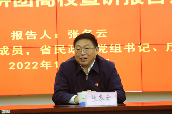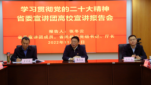 “党的二十大是在全党全国各族人民迈上全面建设社会主义现代化国家新征程、向第二个百年奋斗目标进军的关键时刻召开的一次十分重要的大会,事关党和国家事业继往开来,事关中国特色社会主义前途命运,事关中华民族伟大复兴,在党和国家发展进程中具有重大现实意义和深远历史意义。” 作为党的二十大代表,张冬云感受非常深刻。他从党的二十大的主题和主要成果、过去5年的工作和新时代10年的伟大变革、马克思主义中国化时代化、中国式现代化、全面建设社会主义现代化国家的目标任务、坚持党的全面领导和全面从严治党、应对风险挑战等方面,理论联系实际,全面、深入、系统地宣讲了党的二十大精神;他还为师生解读了党的二十大报告在经济建设、科教人才、社会建设、生态文明建设等方面作出的一系列战略部署,并就高校抓好贯彻落实提出了明确要求,为我校师生讲授了一堂深刻生动的思想政治理论课。