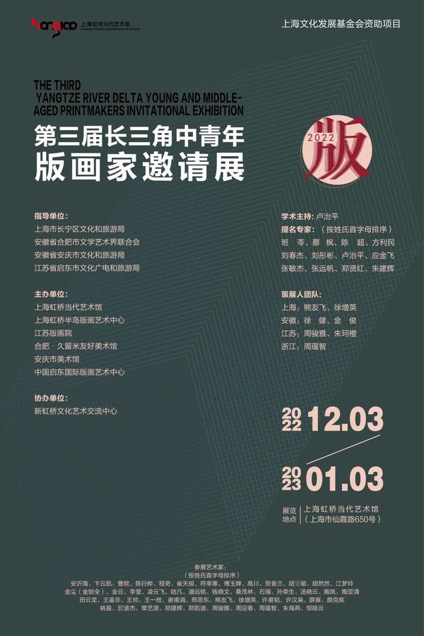 12月3日,由上海虹桥当代艺术馆、江苏版画院和安庆市美术馆等单位联合主办的第三届“长三角中青年版画家邀请展”在上海虹桥当代艺术馆拉开帷幕,展览以多元形态的当代版画展现沪苏浙皖版画艺术的守正创新与蓬勃发展。邀请展着重研究了长三角区域内本土中青年版画艺术家创作过程,利用美术馆的优质资源以及艺术家的创作手稿、草图等,记录、呈现江南版画在年青一代手中的传承、发扬、嬗变、演化的变化轨迹,汇集、梳理和构筑出长三角版画的发展脉络。