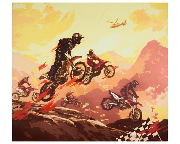 此幅版画采用绝版彩色套印的形式,从构思、创作、刻板到印制完成历时3个多月。整幅画作套印数十版,画面色彩鲜艳。摩托车拉力赛的内容题材表现了赛车手克服一切艰难险阻到达终点的拼搏精神。