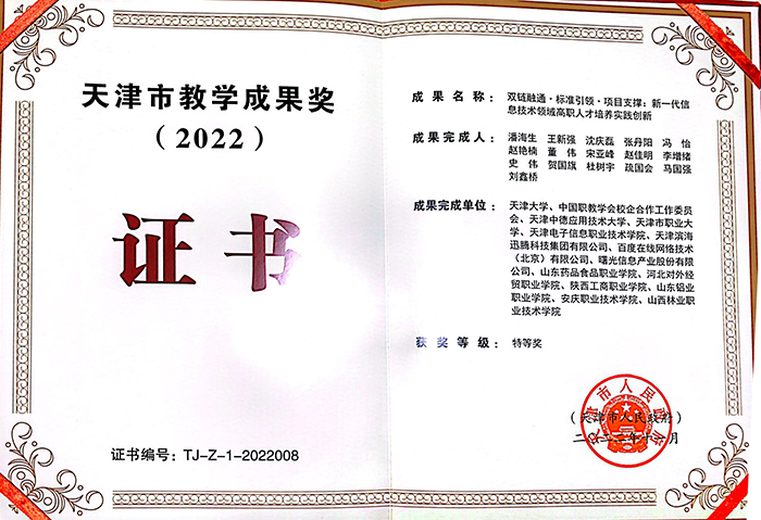 近日,天津市教育委员会发布了《天津市2022年职业教育教学成果奖授奖成果名单》,由天津大学牵头,安庆职业技术学院参与的“双链融通·体系引领·项目支撑:新一代信息技术领域高职人才培养实践创新”项目获天津市2022年职业教育教学成果奖特等奖,并被推荐至教育部参加2022年职业教育国家级教学成果奖评审。
