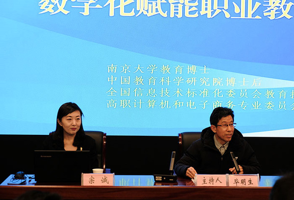 宗诚博士以《数字化赋能职业教育高质量发展的思考》为题,从概念辨析、客观需求、现实样态、实践路径四个方面对职业教育数字化进行解读。她以信息技术发展的历程展开,深入浅出地阐释了职业教育数字化概念的内涵;以经济发展的建设需求、国家政策的外部推动、教育变革的内在趋势三个维度系统分析了职业教育数字化转型是职业教育高质量发展的客观需要;以基础环境、教学设施、教育制度、人才培养等方面全面梳理了职业教育数字化转型的现实样态。最后,她以大量生动的案例,从角色、数据、资源、环境、活动、安全六个角度分别介绍了职业教育数字化转型的实践路径。