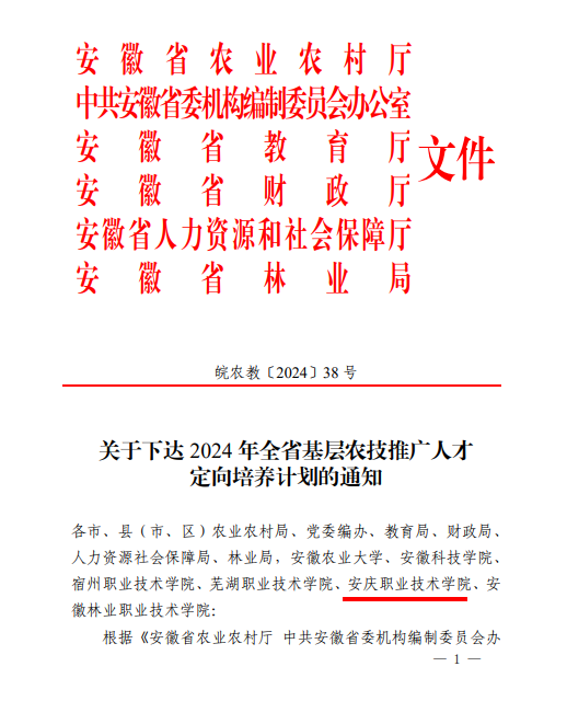 近日,安徽省农业农村厅等六部门联合印发《关于下达 2024 年全省基层农技推广人才定向培养计划的通知》,我校被定为安徽省基层农技推广人才定向培养高校。