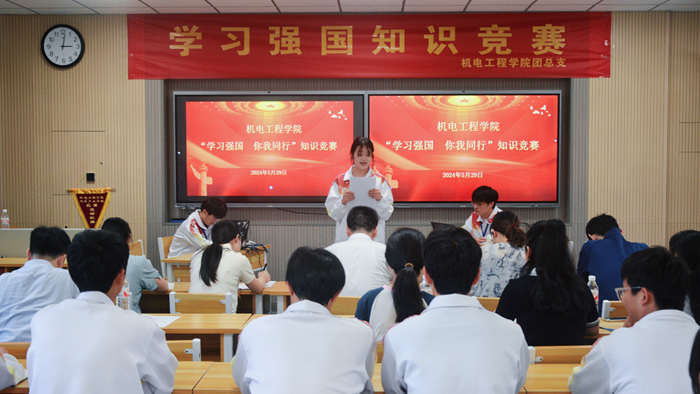 为加强学院“党建带团建”工作,增强学生学习党的理论知识的积极性和主动性,5月29日下午3点,机电工程学院在1号教学楼202教室举办“学习强国,你我同行”知识竞赛活动,机电工程学院学生工作负责人主持活动,学生管理科科长、学生党支部书记、辅导员代表以及青年团员代表等共100余人参加活动。