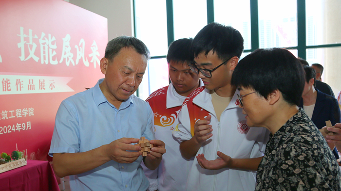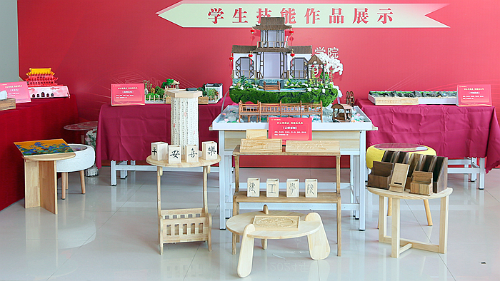 走进展厅,首先映入眼帘的是建筑工程学院的“匠心迎国庆 技能展风采”建筑作品展,这是由建筑装饰工程技术专业和建筑工程技术专业的师生们耗时三个月共同打造完成的。作品《云深雾阁》《梦栖海滩》《荷塘月色》《天安门》等,以新中国成立75周年为主题,将中国传统古建筑与美好居住环境设想完美结合;木制工艺以木制浮雕、鲁班锁、木质书签、漆扇等,采用凹凸部位相结合的连接方式,再将表面打上木蜡油,对中国古代榫卯结构,大漆制作手工艺有了不同的诠释;模型展示以实物模型、3D模型图以及手绘素描等作品形式,不仅展示了古代建筑风格,也诠释了现代建筑新格局。不仅展示了该院各专业的交叉融合,并且希望培养出能识图、能看图、会画图、懂设计、能施工,更能传承中国的传统文化和技艺的高素质技能型人才。