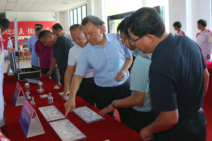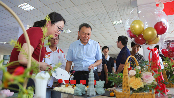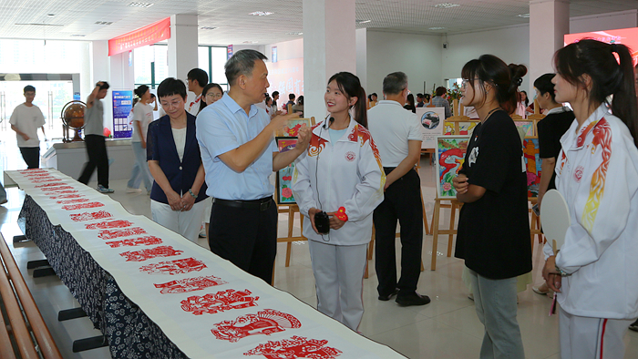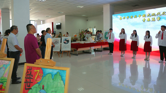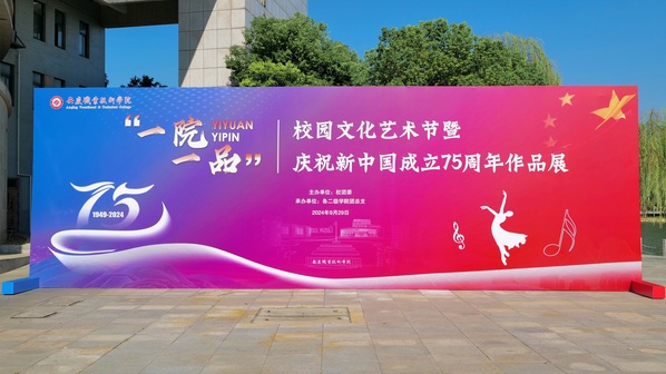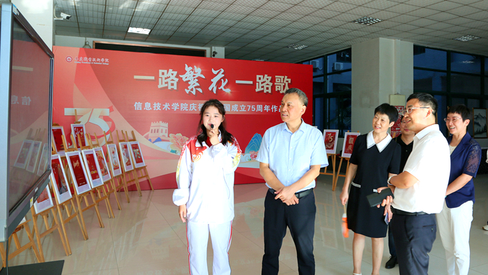 强国复兴有我,礼赞伟大祖国。9月29日,由校团委主办、各二级学院团总支承办的“一院一品”校园文化艺术节暨庆祝新中国成立75周年作品展在图文一楼大厅圆满举行。校党委书记童宏葵,党委副书记李克让,党委委员谭维奇、程飞、陈继平、高润霞、吴何珍、李五一出席并指导展览活动。
