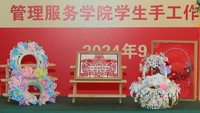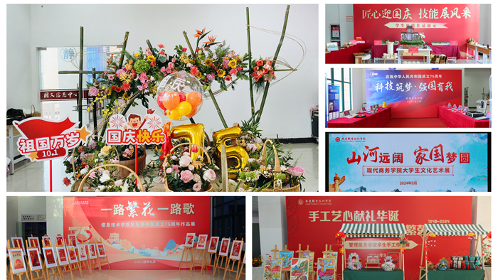 管理服务学院以“手工手艺献礼华诞 共庆祖国繁荣昌盛”为主题,分为插花、剪纸、绘画、手工作品等。该院学生为庆祝中华人民共和国成立75周年的绘画作品,赞美了祖国大好山河和建设成果;有近百米的《56个民族》剪纸作品,将56个民族的服饰元素融入作品中,每个民族的人物形象都力求生动形象,穿着独特的民族服饰和配饰,通过镂空的艺术形式,呈现出各民族的风情和特色。《开国大典》剪纸作品以天安门城楼和华表为主体,再现75年前开国大典的盛况,《中国梦》剪纸作品展现了祖国在航天、军事、交通等领域的辉煌成就,剪刻出自己心中祝福伟大祖国国运昌盛、繁荣发展的中国梦。学生的中式插花作品以松、柏、菊花、竹子为主,寓意四季常青,祖国永远繁荣昌盛,西式插花以麦穗、果实点缀,寓意硕果累累,《杨帆远航》插花作品,以船为造型,寓意杨帆远航、乘风破浪,表达了师生们对祖国美好未来的憧憬与祝福。