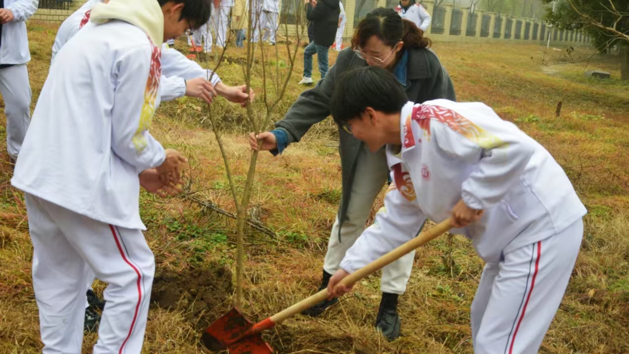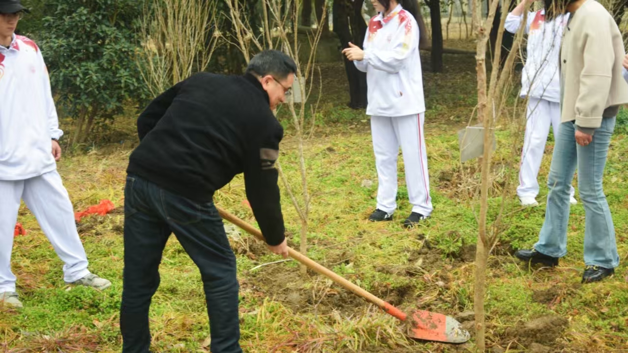 挥锹铲土、扶苗填坑、提水浇灌……纷纷细雨中,师生们分工协作、干劲十足,齐心协力将一棵棵树苗栽种入土。植树现场忙碌而井然有序,经过一上午的辛勤劳动,新栽的树苗迎风挺立,为校园增添勃勃生机。