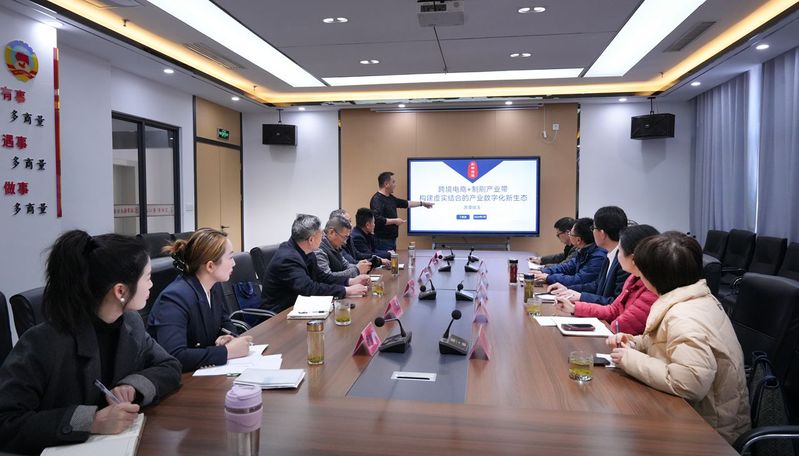 在安徽省刷业商会秘书长丁跃进的陪同下,金启胜一行参观了刷业小镇客厅和“两把刷子”众创空间。丁跃进详细介绍了产业园“一园两仓两平台”(产业园、保税仓与海外仓、刷博会平台及联合刷网平台)的运营模式。目前,源潭刷业产值逾百亿元,规模居全国首位,获评“中国刷业之都”称号。源潭镇还拥有全国唯一的省级刷制品质量监督检验研发中心、全省唯一设于乡镇的“安徽省刷业商会”、全省首个乡镇级保税仓库及跨境电商产业园,为入驻企业提供跨境电商全链条服务,涵盖品牌孵化、物流配送、政策申报及国际营销等环节。