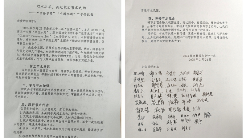 在《校园节水承诺书》签名环节,同学们郑重签下姓名,以契约精神践行节水使命。节水在指尖,责任在心间的共识贯穿活动始终,参与者纷纷表示将从随手关紧水龙头做起,争做节水护水先锋,共建绿色生态校园。(文:刘婷婷 图:刘婷婷 审稿:赵晓彬)