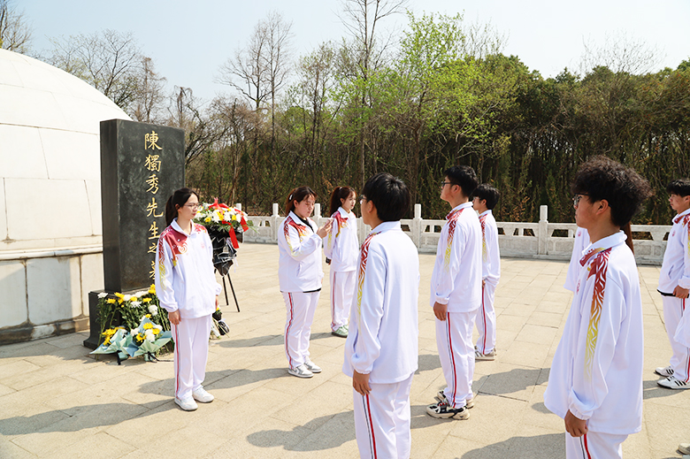 十时许,全体人员在陈独秀先生墓前举行纪念仪式。学生代表带领大家朗诵革命诗词,团总支学生副书记带领全体团员重温入团誓词。最后,同学们向陈独秀墓敬献鲜花并鞠躬默哀,表达对革命先辈的崇敬之情。