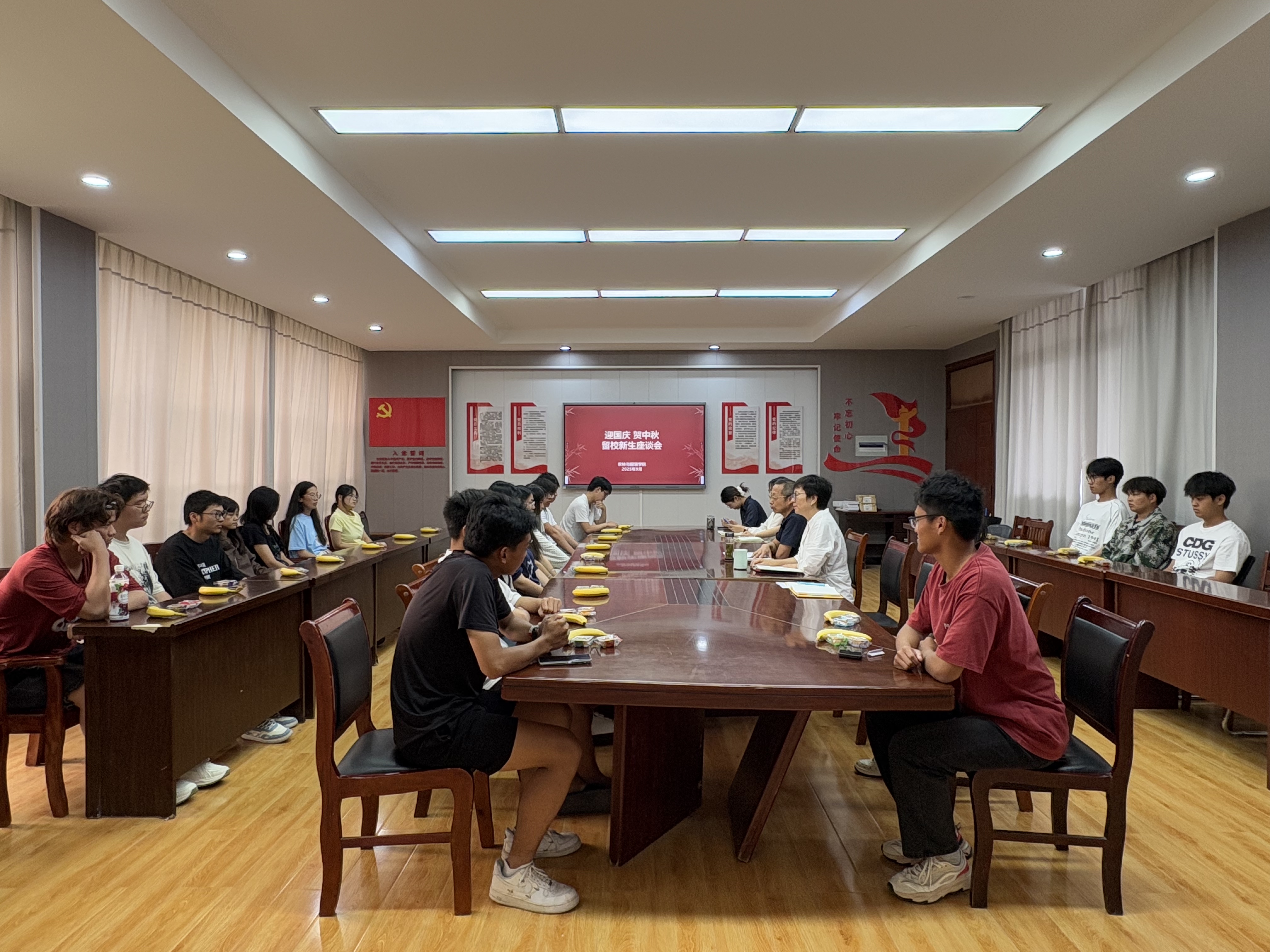 为切实保障留校学生的安全,了解学生需求,传递学院关怀,9月30日,农林与服装学院在会议室召开“迎国庆 贺中秋”国庆假期留校新生座谈会。该党总支书记李进恩、学生工作负责人、2025级新生辅导员以及留校新生齐聚一堂,共话佳节,畅想未来。