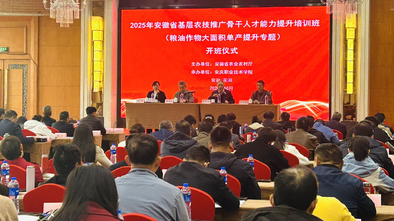 10月28日,安徽省农业农村厅主办,我校承办的安徽省2025年基层农技推广骨干人才能力提升培训班(粮油作物大面积单产提升专题)在芜湖北尚升辉财富大酒店开班。安徽省农业科技教育中心主任崔艺志,芜湖市农业农村局党组成员、副局长廖晓红,安徽省农机推广总站副站长李林鹤出席开班仪式,我校继续教育学院长姚咏主持。全省共计151名学员参加培训。