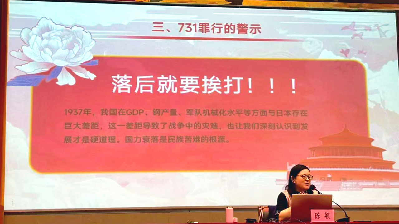管理服务学院党总支书记、院长陈颖以《从731罪行中汲取力量 新时代大学生党员的责任与担当》为题,通过珍贵史料与历史影像,带领学员回顾民族伤痛,深刻领悟“落后就要挨打”的历史警示。课程激励大家以史为鉴,将历史感悟转化为践行初心使命的强大动力,在新时代扛起青年一代的历史责任。