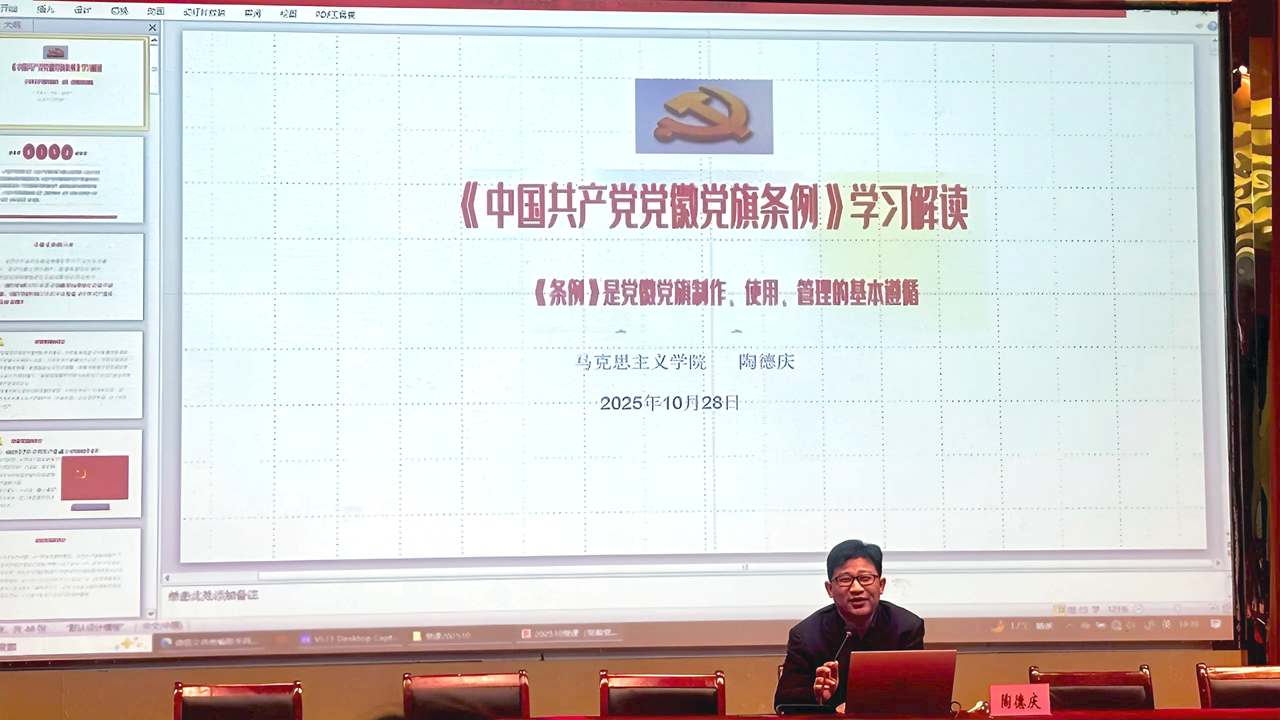 马克思主义学院陶德庆老师专题解读《中国共产党党徽党旗条例》。他从党徽党旗的历史演进讲起,详细阐述了其深刻内涵与使用规范,强调维护党徽党旗尊严就是维护党的尊严,引导学员自觉尊重、爱护和规范使用党的标志,增强政治认同与组织观念。