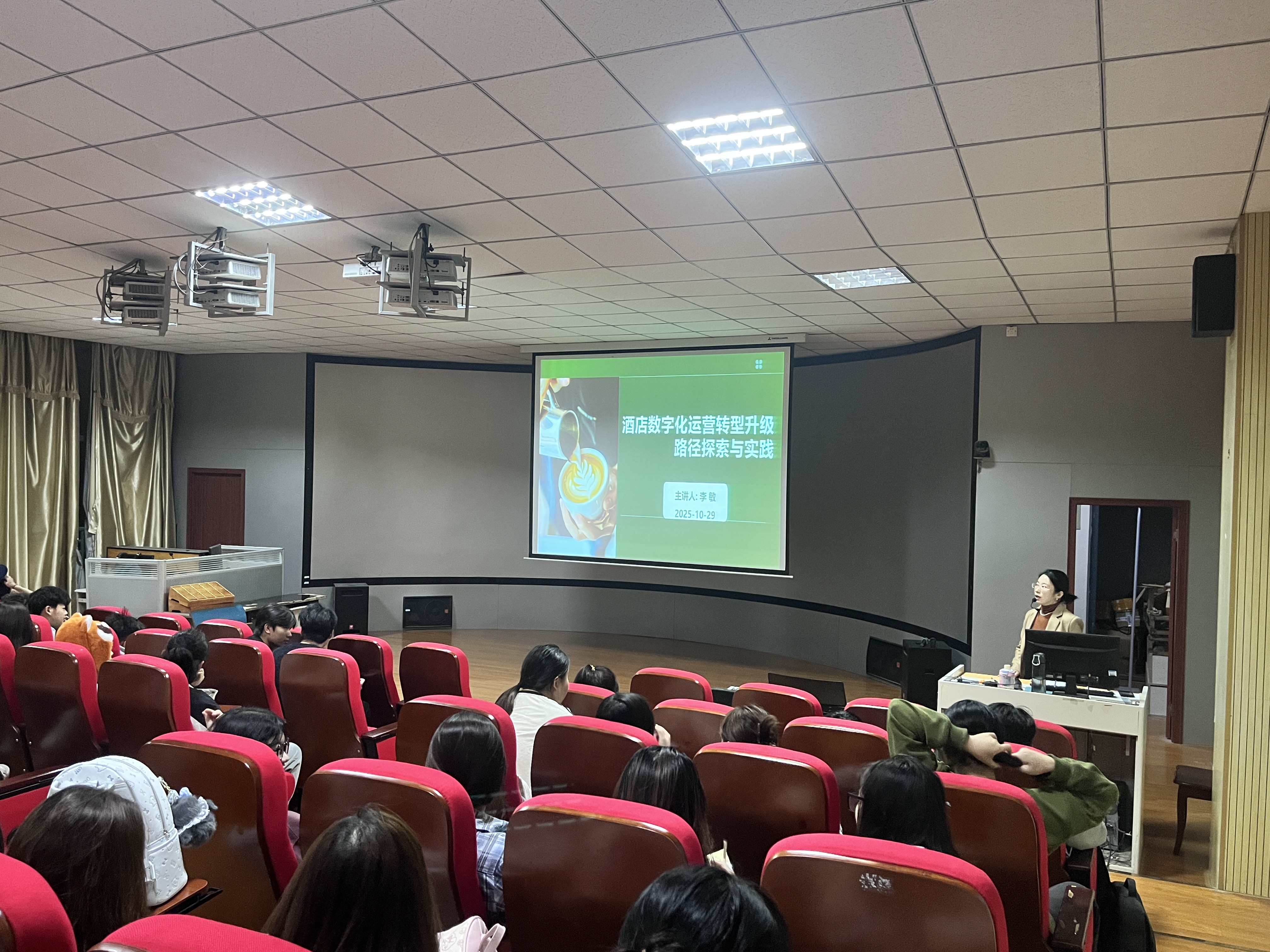 10月29日晚上,管理服务学院李敏副教授在3号教学楼216教室为2025级酒店管理与数字化运营专业130名师生带来题为《酒店企业数字化运营转型升级路径探索与实践》的专题讲座。