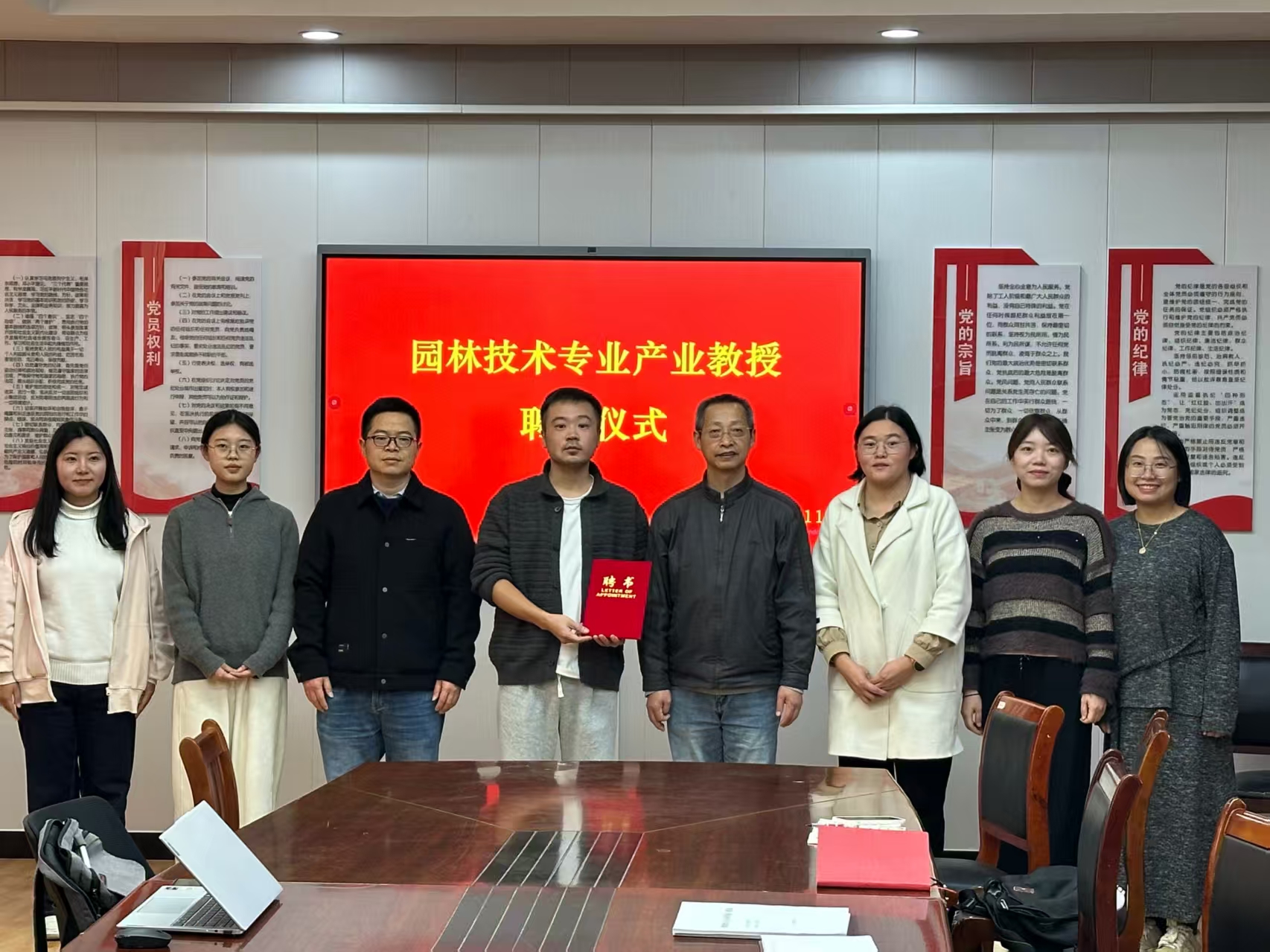 11月11日,园林技术专业团队在2号教学楼414室开展产业教授聘任及合作对接会议。会议邀请产业教授胡海峰出席,农林与服装学院院长李进恩、教学管理负责人及园林技术专业教学团队教师参加会议。