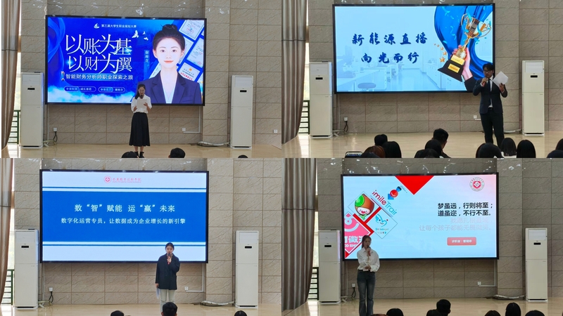 本次大赛以“筑梦青春志在四方,规划启航职引未来”为主题,7名选手围绕自我认知、职业环境分析、职业目标设定、路径规划、评估调整等核心内容,通过PPT展示与现场答辩的形式,全面阐述个人职业生涯规划。有的选手聚焦行业领域前沿,将数字运营专员作为职业方向,结合行业发展趋势制定阶梯式成长计划;有的选手立足专业优势,瞄准智能财会岗位,通过实践经历与技能储备论证目标可行性;还有的选手结合乡村振兴战略,计划返乡投身农产品销售行业,将专业知识转化为服务地方发展的实际力量。选手们逻辑清晰的规划、自信从容的表达与贴合实际的职业构想,赢得了评委与现场观众的阵阵掌声。