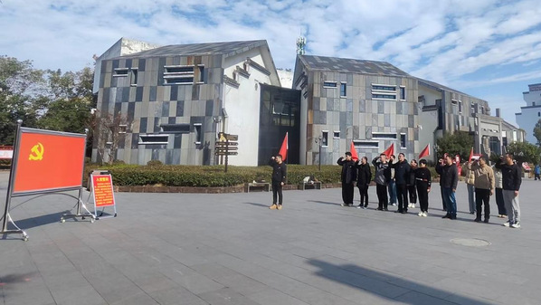 在庄严肃穆的纪念馆广场,面对鲜红的党旗,全体党员在该党总支组织员的带领下,高举右拳,重温入党誓词。