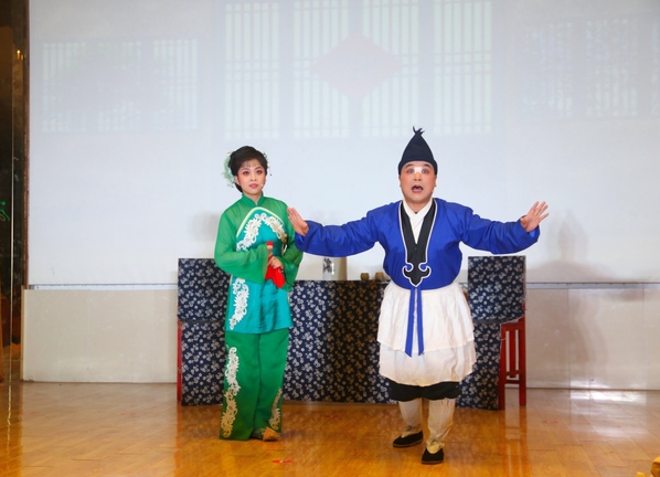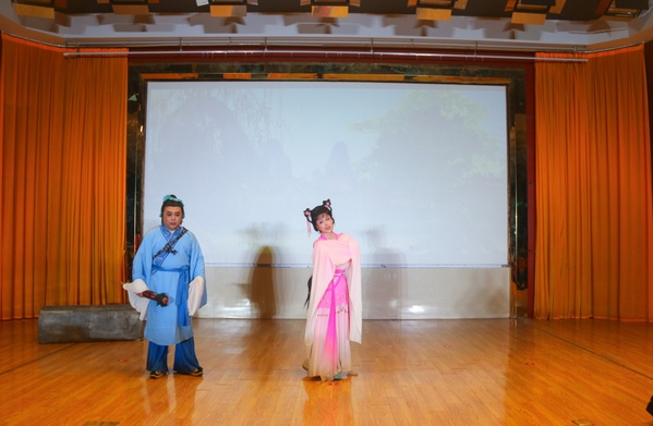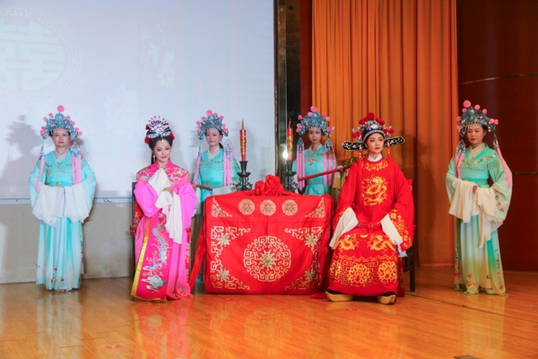 新编小戏《二妹子闹元宵》率先登台,演员们身着质朴灵动的戏服,通过黄梅戏花腔小调的唱腔表现形式,把老百姓小人物的憨厚质朴展现得淋漓尽致。传统小戏《打豆腐》将点燃现场欢乐气氛,演员们夸张传神的肢体动作、活灵活现的表情神态、惟妙惟肖的生动演绎,让台下同学笑得前仰后合。《天仙配》选场“路遇”的熟悉旋律缓缓流淌,现场瞬间陷入静谧,传统神话故事的缱绻意蕴娓娓道来。演出最后,《女驸马》选场“洞房”精彩上演,演员们身着绣工精美的戏服,头戴玲珑精致的头饰,一出场便惊艳四座,婉转多变的唱腔时而低沉压抑、时而高亢坚定,让同学们仿佛置身其中一起感受故事的跌宕起伏。