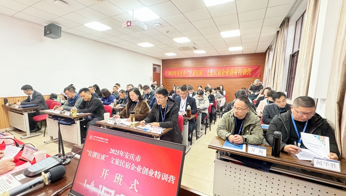 12月12日,安庆市人力资源和社会保障局、安庆市文化和旅游局联合举办,我校承办的2025年安庆市“宜创宜成”文旅民宿企业创业特训营在浙江大学正式开班。安庆市人社局党组书记、局长王志节,我校党委副书记李克让出席开班仪式。来自全市文旅民宿行业的创业骨干、乡村旅游经营者和青年创业者共40余人参加培训。