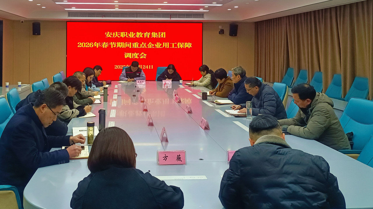 12月24日下午,安庆职教集团在安庆职业技术学院召开春节期间园区重点企业用工保障调度会。安庆职教集团副理事长、秘书长李克让主持会议。安庆技师学院、安庆工业学校、安徽理工学校、安徽化工学校等集团内城区中职、技工院校主要负责人,安庆职业技术学院6个二级学院主要负责人参会。