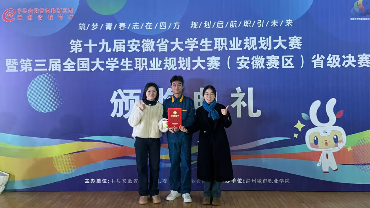 1月17日,第十九届安徽省大学生职业规划大赛暨第三届全国大学生职业规划大赛(安徽赛区)决赛在滁州城市职业学院圆满落幕。凭借清晰的职业规划、扎实的专业素养,我校机电工程学院韩信同学斩获成长赛道职教组金奖,管理服务学院刘敏杰同学荣获就业赛道职教组银奖,充分展现了我校学子卓越的职业规划能力与青春风采,为学校赢得了荣誉。