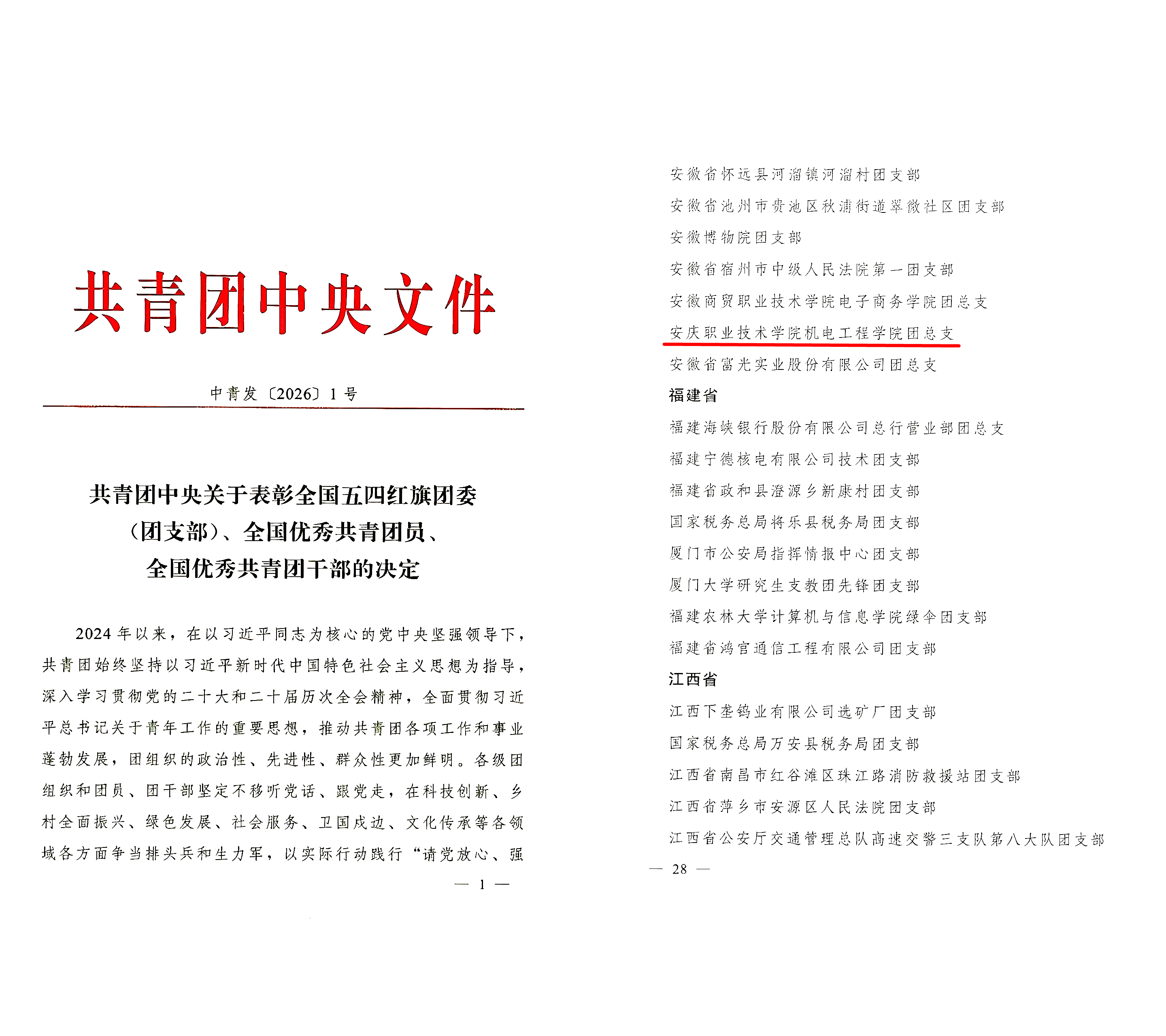 近日,共青团中央印发《关于表彰全国五四红旗团委(团支部)、全国优秀共青团员、全国优秀共青团干部的决定》,安庆职业技术学院机电工程学院团总支成功获评“全国五四红旗团(总)支部”荣誉称号。这是对该团总支深耕组织育人、引领青年成长、践行青春担当工作成效的最高肯定,也是其在荣获“安徽省五四红旗团总支”和“安庆市五四红旗团总支”之后的又一次突破。