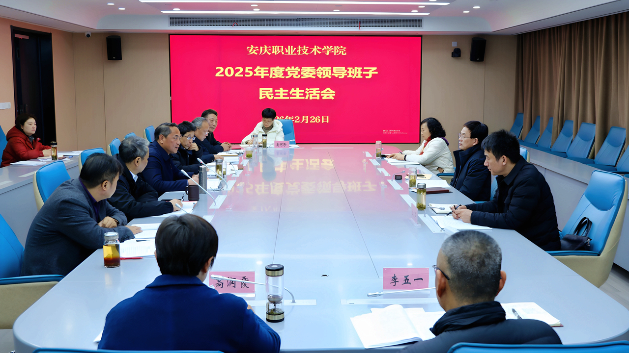 根据市委统一部署,2月26日上午,安庆职业技术学院党委领导班子召开2025年度民主生活会。会议紧扣“深入学习贯彻习近平新时代中国特色社会主义思想,全面贯彻落实党的二十届四中全会精神,锲而不舍落实中央八项规定精神,推进作风建设常态化长效化”主题,紧密结合思想和工作实际,深入查摆问题,深刻剖析根源,严肃开展批评和自我批评。市纪委常委、监委委员徐华三,市委组织部四级调研员张晓玫,市纪委监委第七纪检监察室副主任江志军到会指导。校党委书记潘功发主持会议并讲话,校党委班子成员参加会议。