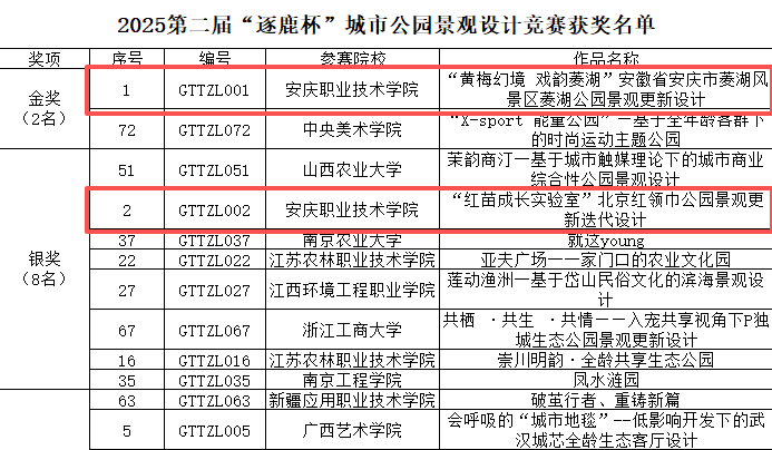 4月16日,由中国风景园林学会、中国风景园林行业产教融合共同体指导,全国园林行业产教融合共同体主办的第二届“逐鹿杯”城市公园景观设计竞赛在江苏农林职业技术学院圆满落幕。我校园林技术专业选送的两件作品在众多本专科院校中脱颖而出,获得金奖第一名、银奖第二名。张亚萍、余碧霞获优秀指导老师奖。