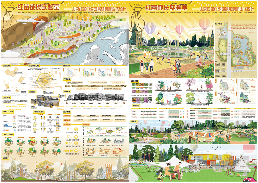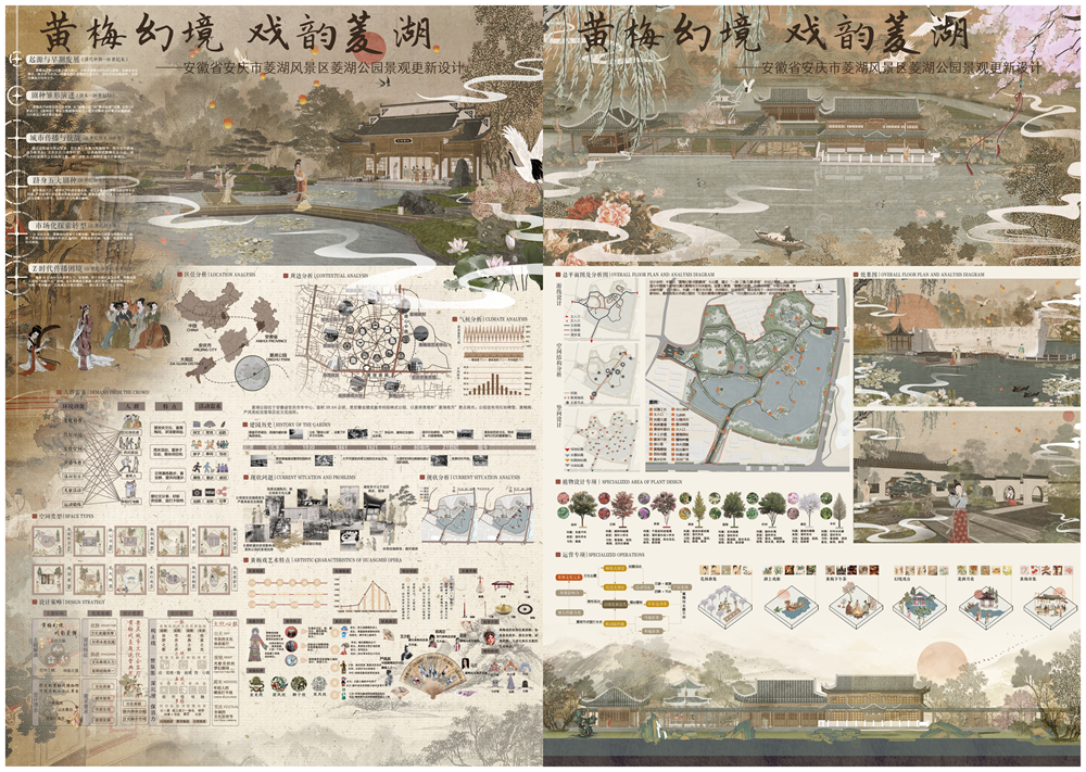 本次竞赛以“焕新绿色空间,共筑诗意栖居”为主题,聚焦城市公园功能迭代,致力于为提升公园生态价值、促进人文融合与智慧升级提供助力,探索更具温度、创意与韧性的设计方案及实践路径。我校参赛作品“黄梅幻境 戏韵菱湖”——安徽省安庆市菱湖风景区菱湖公园景观更新设计,以安庆本土黄梅戏文化为灵感,将戏曲元素与公园景观更新相结合,通过戏曲主题空间序列、声景营造与游线组织,为菱湖公园注入了独特的文化体验,成功斩获金奖第一名。“红苗成长实验室”——北京红领巾公园景观更新迭代设计作品,通过“红色叙事空间、年龄分段活动、智慧互动体验”三大策略,推动公园从静态纪念地向儿童共建的红色成长赋能平台转型,成功斩获银奖。