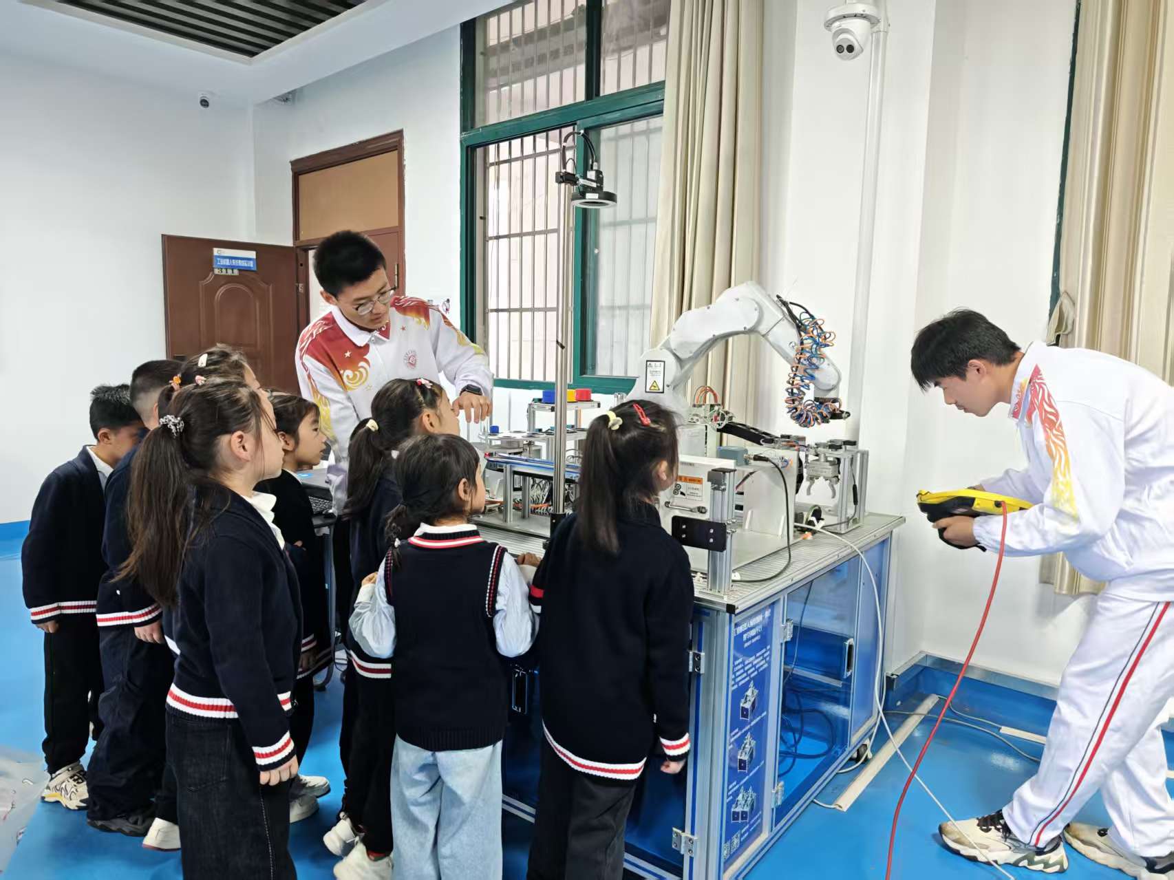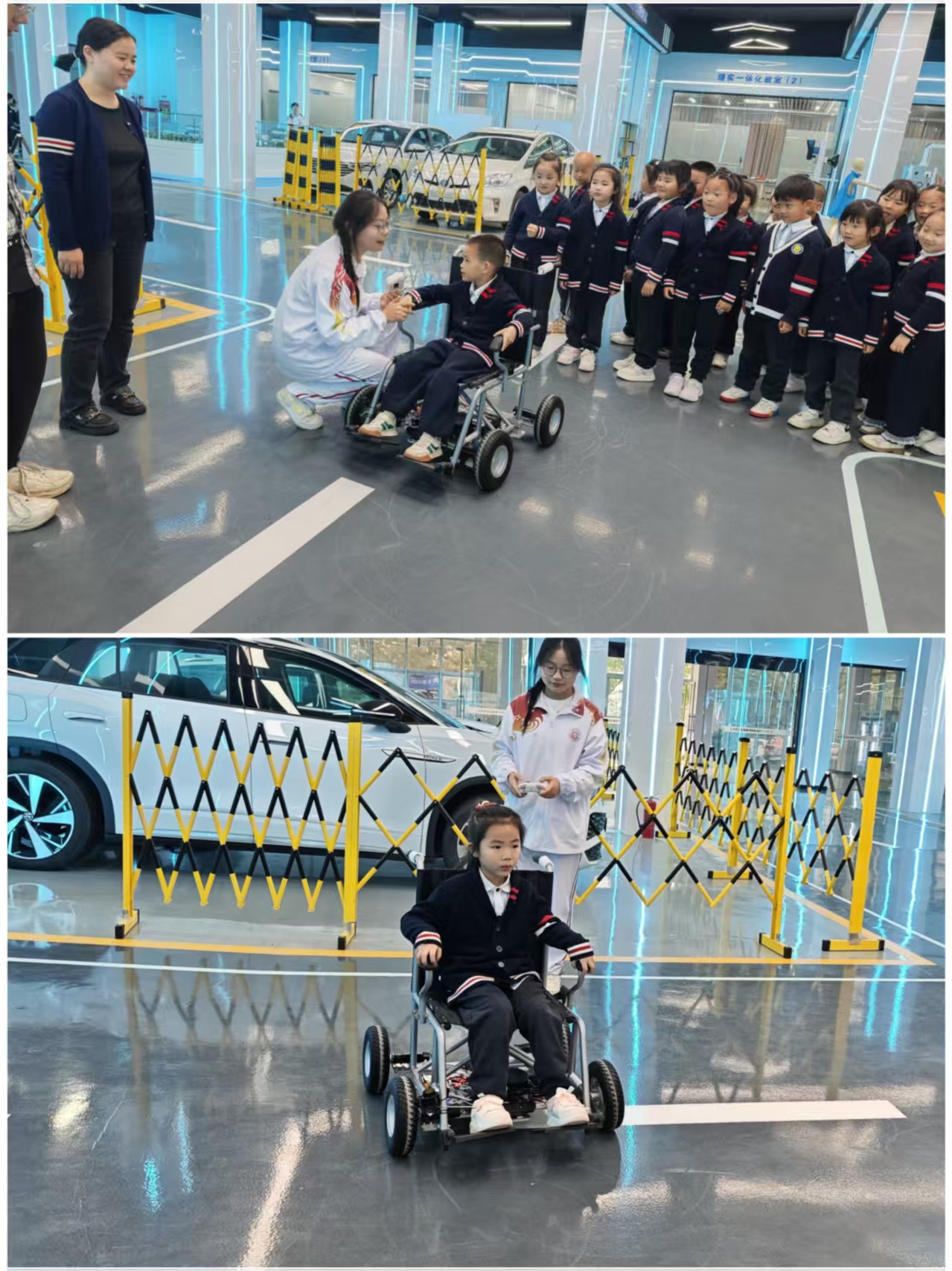 活动当日,幼儿园师生一入校便受到热情接待。在志愿者引导下,孩子们首先来到机电工程学院新能源汽车基地。师生们用童趣语言讲解新能源汽车的环保特性与智能驾驶功能,并展示学院自主研发的智能轮椅。不少小朋友坐上轮椅亲身体验,近距离感受科技魅力。随后,孩子们走进智能机器人实训基地,观看机械臂精准抓取、搬运物品的演示。看到机械臂灵活运转,小朋友们目不转睛、连连惊叹。