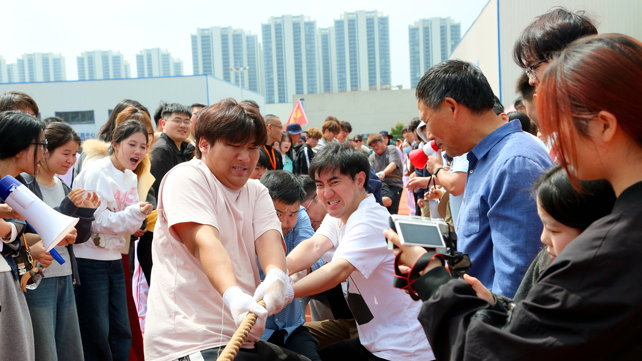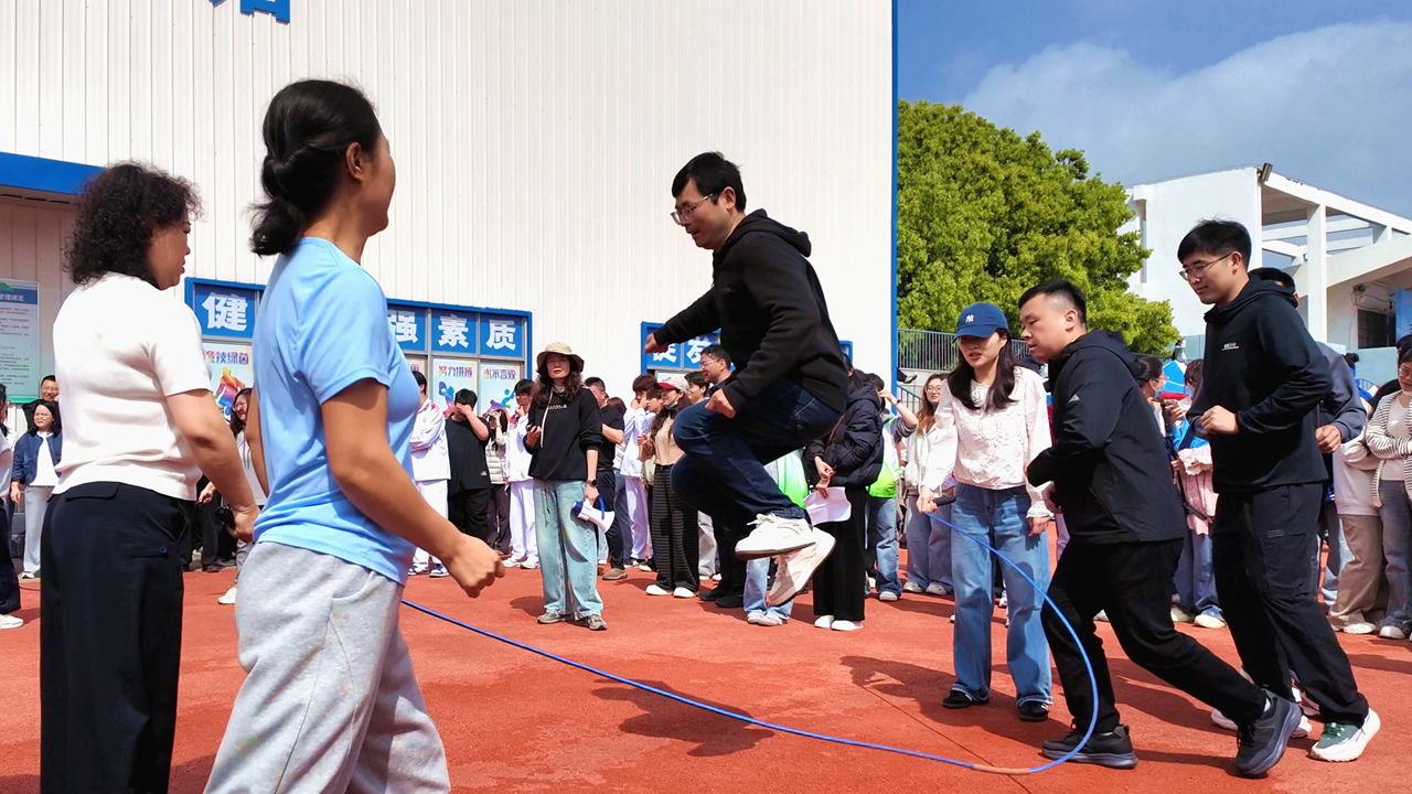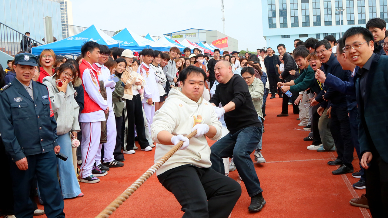 教职工趣味赛项中,“8字跳绳”赛项由管理服务学院代表队折桂;拔河赛项由机电工程学院代表队获得冠军。