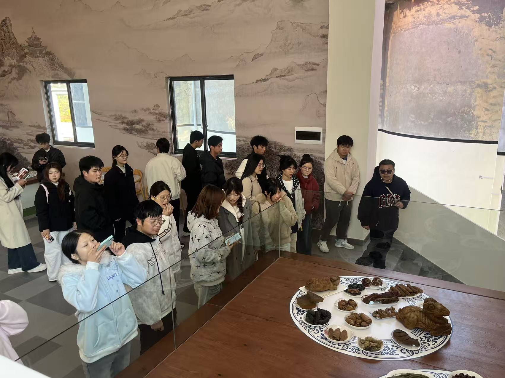 在园区讲解员的带领下,学生们穿梭于由废旧厂房改造的桩坑艺术馆、根雕馆、长桌宴及中国民居场景馆之间,亲身感受“工业遗存+文化艺术+旅游休闲”的独特魅力。巨大的水泥罐、斑驳的红砖墙与充满现代感的艺术装置形成了强烈的视觉冲击,让同学们对旅游资源的创造性开发有了更直观的理解。园区在改造中坚持“修旧如旧”的理念,通过微改造、精提升,将工业记忆转化为可感知的文化空间,为学生们上了一堂生动的实践课。