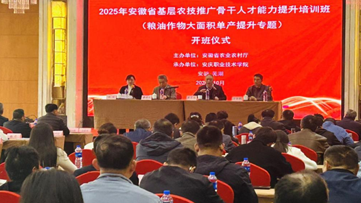 2025年10月28日,由安徽省农业农村厅主办,安庆职业技术学院承办的安徽省2025年基层农技推广骨干人才能力提升培训班(粮油作物大面积单产提升专题)在芜湖北尚升辉财富大酒店顺利举行。安徽省农业科技教育中心主任崔艺志,芜湖市农业农村局党组成员、副局长廖晓红以及安徽省农机推广总站副站长李林鹤出席开班仪式,由安庆职业技术学院继续教育学院院长姚咏主持。全省共计151名学员参加培训。