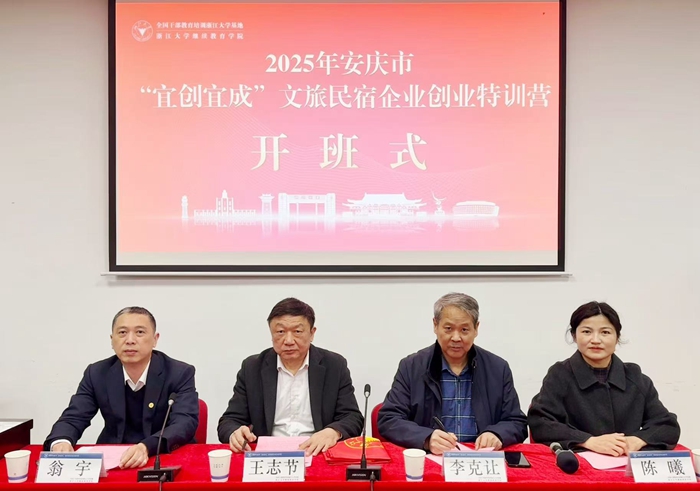 为深入贯彻落实“文旅兴市”战略,加快推进“一创一城”创业型城市建设,2025年12月12日,由安庆市人力资源和社会保障局、安庆市文化和旅游局联合举办安庆职业技术学院承办的2025年安庆市“宜创宜成”文旅民宿企业创业特训营在浙江大学正式开班。安庆市人社局局长王志节、我校党委副书记李克让出席开班仪式,来自我市文旅民宿行业的创业骨干、乡村旅游经营者和青年创业者共40余人参加。