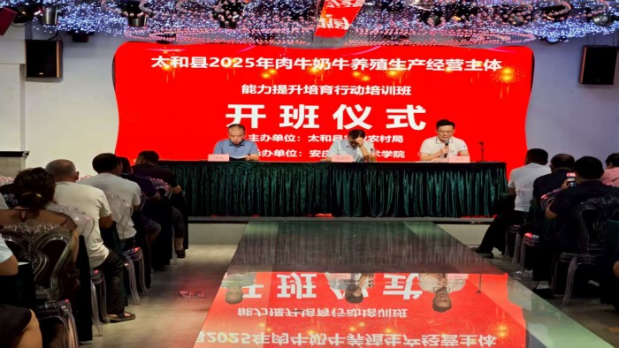 近日,由太和县农业农村局主办、我校承办的“太和县2025年肉牛奶牛养殖生产经营主体能力提升培育行动培训班”正式开班。本次培训旨在进一步提升太和县肉牛奶牛养殖户的生产经营能力和综合素养,推动当地畜牧业高质量发展。
