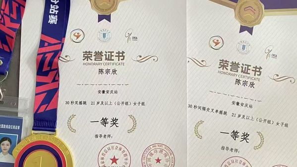 本次赛事由国家体育总局社会体育指导中心、中国毽球跳绳协会主办,全国跳绳推广委员会等单位承办,以“推动跳绳运动普及、助力青少年体育发展”为宗旨,在安庆市的赛事场馆内,来自各地的跳绳爱好者齐聚一堂,展开了一场速度与技巧的较量。赛场上,陈老师身姿矫健、节奏明快,凭借精湛的跳绳技艺在两个项目中稳定发挥,最终以优异成绩将两项一等奖收入囊中。
