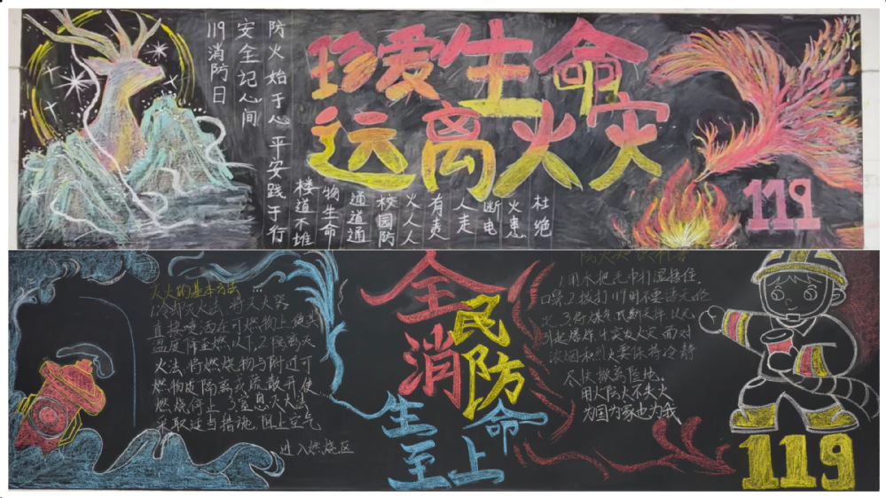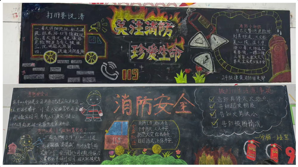各班级充分利用教室后方“文化阵地”,精心策划绘制了以“119”消防安全为主题的黑板报,生动展示电器安全使用年限、充电注意事项、插线板负荷标准、火场逃生路线图等内容。这些直观形象的宣传,时刻提醒师生关注身边隐患,也让消防安全知识融入日常学习环境。