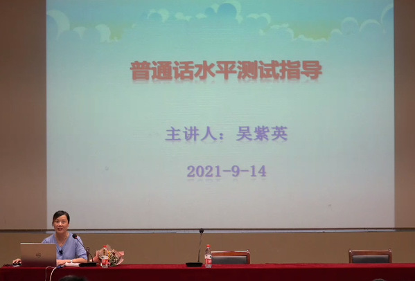 9月14日18点30分,我校在图文信息一楼报告厅开展全国推广普通话宣传周专题讲座——普通话水平测试指导。本次讲座校语委办、教师发展中心邀请了国家级普通话水平测试员吴紫英副教授主讲,来自全校200名师生现场听取了讲座,本次讲座在线上进行了同步直播。