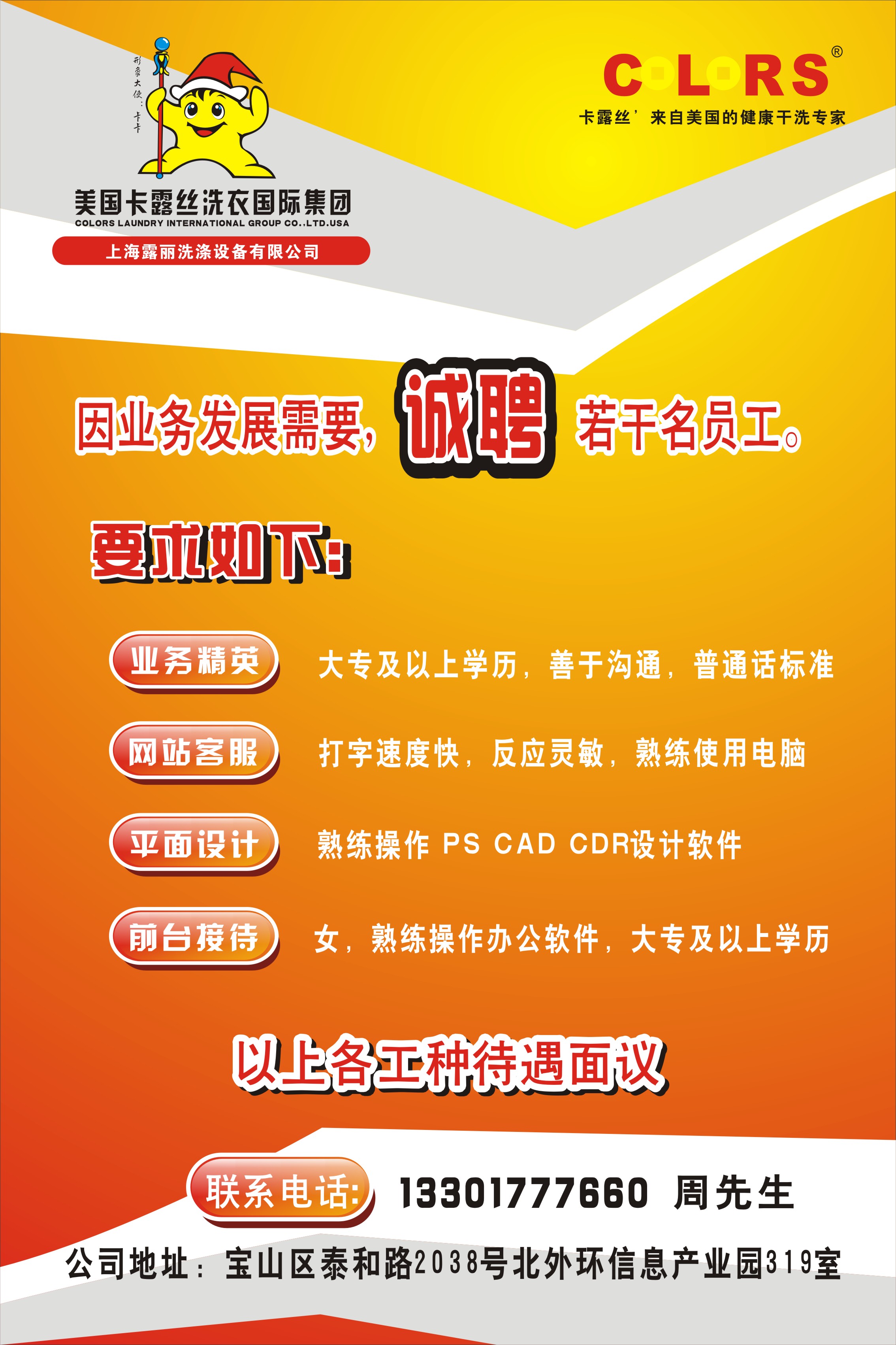 上海露丽洗涤设备有限公司负责国内机器的生产、销售、卡露丝品牌加盟等一系列业务和服务,洗涤技术、洗涤设备在世界处于领先水平。同时属于中国洗涤行业协会成员单位,被上海洗涤行业单位评为“消费者信得过的连锁品牌”,洗涤设备经国家轻工业(服装、洗涤)机械质量监督检测中心鉴定。 上海露丽洗涤设备有限公司坐落于上海市宝山工业园区南汀路101号靠近淞滨路,拥有大型的生产基地和生产厂房,获得美国卡露丝干洗连锁总部设备研究中心专家指导和产品开发,凭借国际设备研发人员丰富的经验、领先的技术,专业开发生产全自动环保石油干洗机、全封闭全自动四氯乙烯干洗机、全自动洗脱烘一体机、全自动变频水洗机、烘干机、熨烫机、洗脱机、烫平机、消毒柜、包装机、输送线等212个品种,全力打造和服务我国干洗水洗行业的发展,为干洗店、洗衣房提供最合适的设备和最先进的技术。 上海露丽洗涤设备有限公司承担美国卡露丝干洗连锁在中国区的加盟事业拓展和经营管理,为现有的2300多家卡露丝连锁店提供全方位的服务,以强大的品牌、独特的连锁服务为更多的人提供创业机会、创造价值、带来财富! 如今的卡露丝“COLORS”干洗品牌已拥有一批高级洗涤技术师队伍,奋发向上的市场运营团队,通过对不同服务面料的深入研究,对洗涤原料进行科学创新,全面提高服务的洗涤技术。我们对洗衣店采用科学的经营管理,独特的洗衣店形象设计,有效的提高了洗衣店的营业收入,使得卡露丝品牌在短短几年时间内在“深度、广度、速度”上遍布全国。我们仍将努力,面对新的挑战,卡露丝人将以“积极、努力、谦虚”的态度树立我们的品牌形象,以“做服务、做质量、做信誉”为宗旨,秉承“因为我们专业,所以我们卓越”来立足上海,辐射全国特许经营加盟连锁,全力服务于社会。