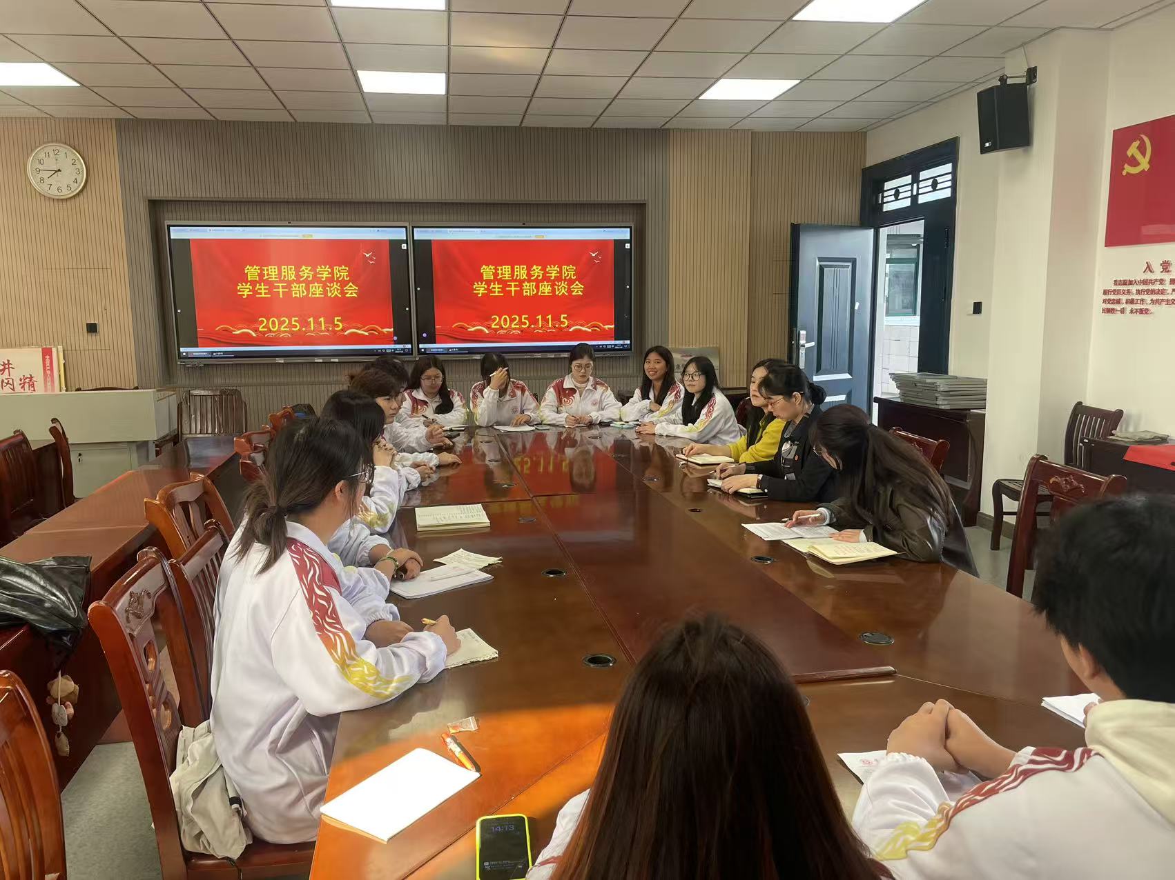 随后,学院组织召开第八届学生委员会第一次全体会议暨学生干部座谈会。学生干部们直奔主题,围绕工作中遇到的实际困难与改进思路畅所欲言。面对大家的困惑,丁凡现场逐一解答,并表示学院将致力于打造学习型组织,把常态化的业务研讨与针对性的专题培训紧密结合,为学生干部的持续成长赋能助力。她希望学生干部坚持问题导向和目标导向,确保各项工作落到实处、取得实效。团总支书记梁妞就打造品牌活动、创新宣传形式等方面提出指导意见,鼓励结合专业特色,推动“一院一品”文化建设。