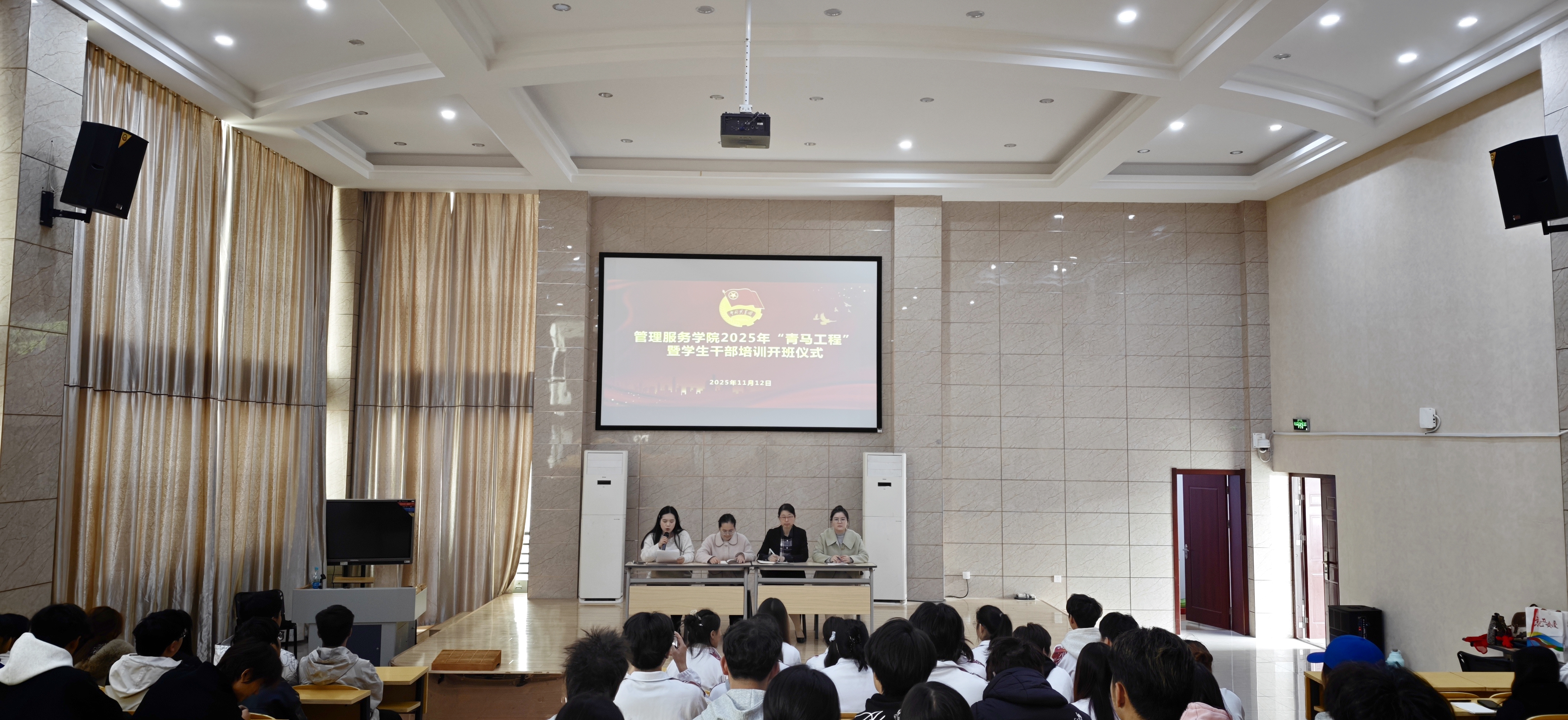11月12日,安庆职业技术学院管理服务学院2025年“青马工程”暨学生干部培训开班仪式在学院报告厅举行。学院学生工作负责人、学生管理和团总支负责人、全体学员及学生干部代表参加仪式。