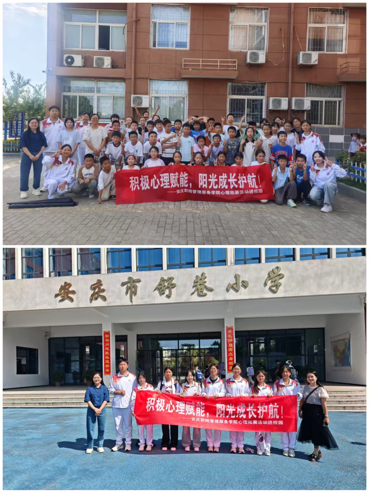 为缓解舒巷小学、十里铺中心学校学生心理支持不足问题,帮助学生缓解学业压力与成长焦虑、放松心情,管理服务学院于9月19日上午组织师生团队,前往安庆市舒巷小学、十里铺中心学校为六年级的同学们带来了一场以“积极心理赋能  阳光成长护航”为主题的心理拓展活动。活动通过一系列精心设计的趣味游戏,引导同学们在合作与体验中学习情绪管理、团队协作与沟通表达。