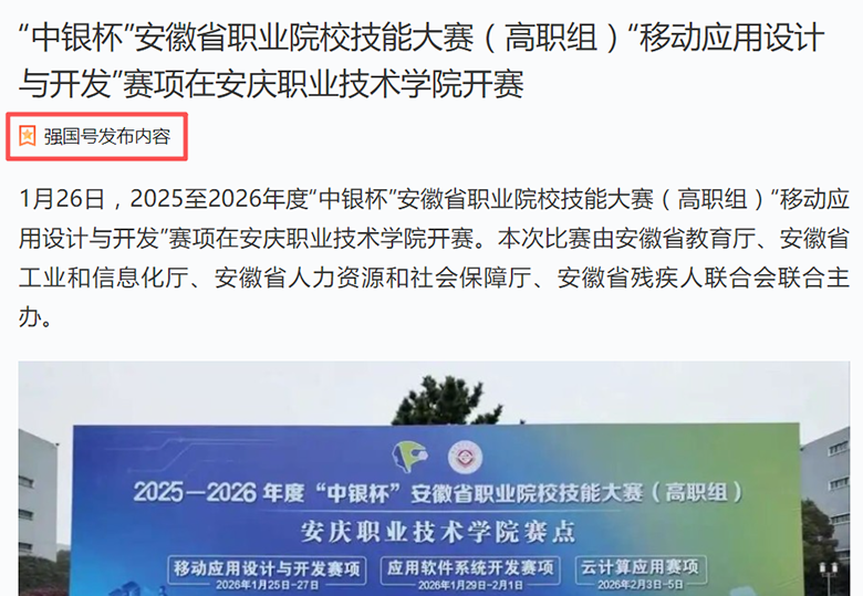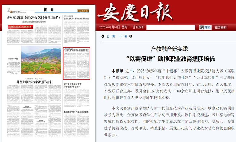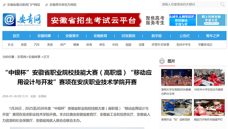 安庆职业技术学院信息技术学院成功承办2025-2026年度安徽省职业院校技能大赛(高职组)“移动应用设计与开发”“应用软件系统开发”“云计算应用”三个赛项,获“学习强国”“安青网”等多家权威媒体报道。