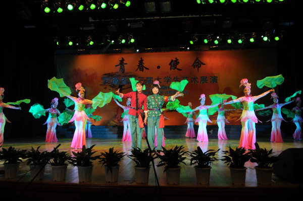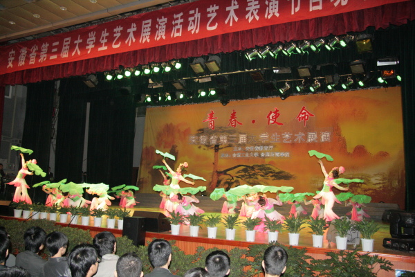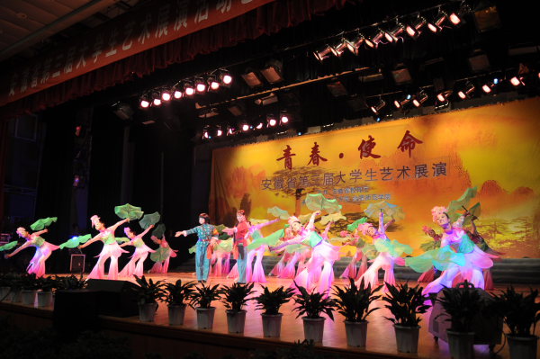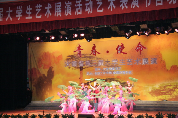 11月9日晚,由安徽省教育厅主办,合肥工业大学和合肥师范学院共同承办的“安徽省第三届大学生艺术展演活动艺术表演节目现场展演”在合肥工业大学斛兵礼堂举行。我院选送的黄梅歌舞——《洪湖水,浪打浪》节目参加现场展演,并受到广泛好评。
