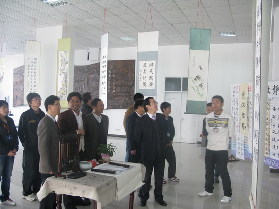 上午,院长孙晓峰、党委副书记张旺牛、副院长毕明生在学生处负责同志及逸风书法社指导老师的陪同下前往展览地点参观了书画展。院领导听取了本次展览的作品及书法社发展情况的介绍。在看到一幅幅技艺精美、装裱精湛的书画作品后,领导和老师们赞不绝口。孙院长称赞此次活动具有重要意义,为我院学生提供了学习国粹文化的平台,并鼓励书法社要再接再厉,多举办类似的活动,陶冶同学们的课余文化生活,为繁荣我院校园文化建设作出更大的贡献。