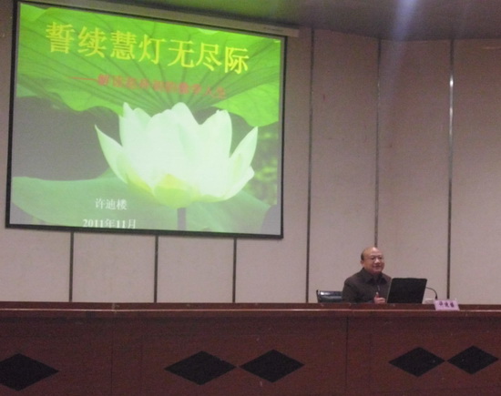 11月29日晚,图文信息中心副主任许迪楼副教授在图文信息中心大报告厅为500余名学生作了题为“《誓续慧灯无尽际:解读赵朴初的佛学人生》”的讲座。这次讲座是“基于科学人文艺术融通的学生素质拓展体系构建”示范建设项目下“安庆文化名人系列讲座”八讲中的一场。