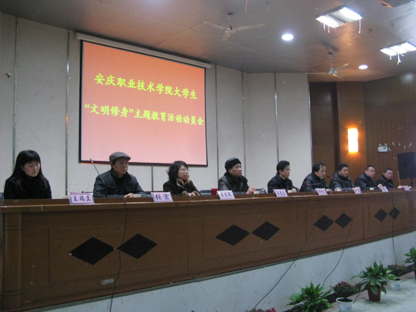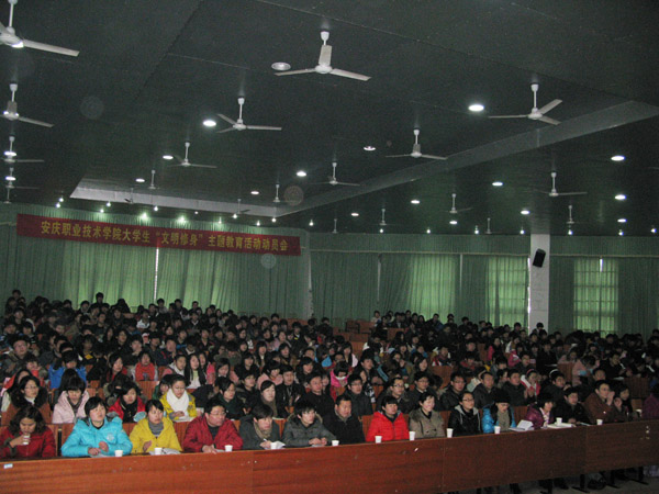 毕明生在仪式上指出,中华民族的传统美德需要一代代青年人使之发扬光大,文明素质不可丢弃。他通过生动、具体的身边实例,用幽默的语言讲述了社会上存在的不文明、不雅观的现象,推心置腹、谆谆教导。最后,他提出了三点要求。一是要加强宣传,营造氛围。把主题教育活动与学生成长成才结合起来,与优良校风建设结合起来,与建设省级示范高职院校和创建省级文明单位结合起来。二是要强化措施,明确责任。希望广大学生干部要积极参与主题教育活动,带头学习《高等学校学生行为准则》和《大学生日常行为规范》,对照准则找方向,对照规范找差距。三是要齐抓共管,形成合力。本次主题教育活动集中开展校园“五大文明”建设,即举止文明、学习文明、生活文明、网络文明和交往文明,覆盖了学生校园生活的全部内容,涉及到学校管理的方方面面,需要各处室、各系部齐抓共管,需要全体学生干部积极参与,共同配合。他希望通过这次主题教育活动,在全院上下掀起讲文明、树新风的热潮,倡文明之风,兴文明之举,践文明之行,让文明之花开满校园,让安庆职业技术学院的每一名学子都成为情趣高雅、思想高尚、举止文明,勤学笃行、德技双馨的优秀大学生。